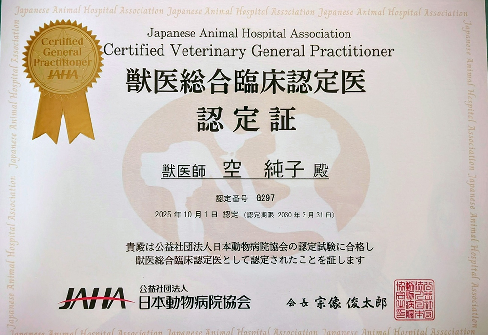 このたび、当院の獣医師【空】が公益社団法人 日本動物病院協会(JAHA)による「獣医総合臨床認定医」に認定されました。