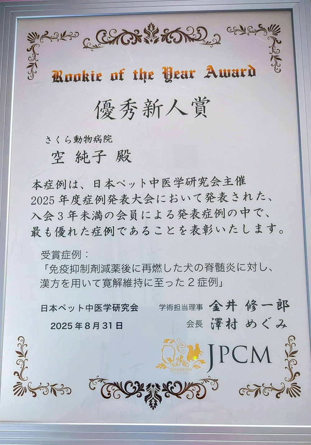 また併せて、日本ペット中医学研究会主催「2025年度 症例発表大会」において、当院の症例発表