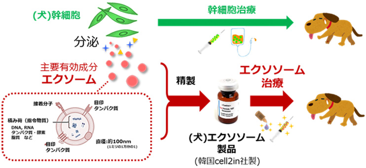 幹細胞を身体に投与するのが幹細胞療法ですが、細胞を使う治療はデリケートで、飼い主様・病院ともにやや不便な点はあります。幹細胞療法の治療効果は幹細胞からの分泌物によってもたらされます。分泌物の1成分・エクソソームは多くの指令物質を積んだ極小の袋状の物質(細胞外小胞の1種)で、効果発現の主要成分です。幹細胞療法のエキスともいえる成分だけを大量に集めて投与するのが幹細胞エクソソーム療法。幹細胞療法の効果を100%発揮できるわけではありませんが、似たような効果を得られることがわかっています。対象となる疾患は幹細胞療法とほぼ同じです。